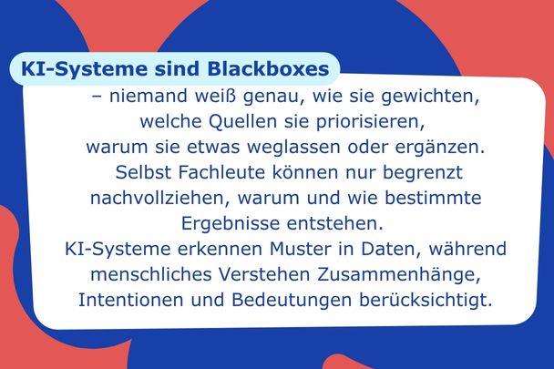 KI-Suchmaschinen liefern schnelle Ergebnisse auf die Suchanfrage, doch nach welchen Kriterien kommt sie zu ihren Entscheidungen? Dieses Phänomen wird als sogenanntes Blackbox-Problem bezeichnet: Die Entscheidungen der KI-Systeme, die hinter den KI-Zusammenfassungen stecken, sind für die Nutzerinnen und Nutzer nicht nachvollziehbar.