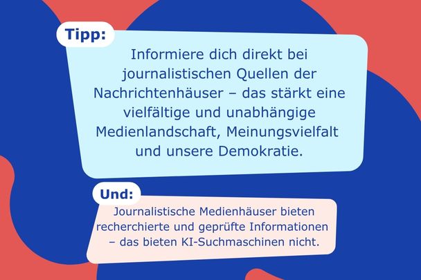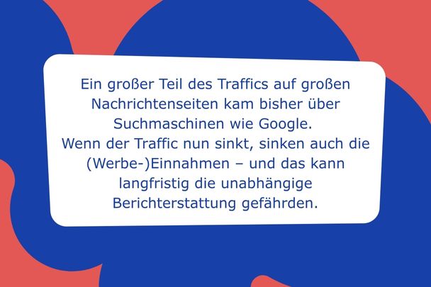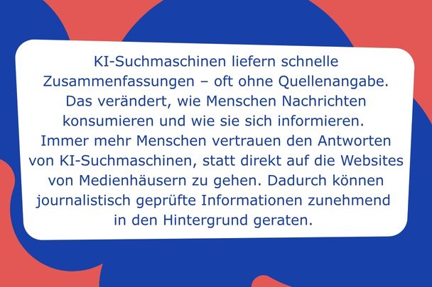 Nur wenige KI-Zusammenfassungen von Suchmaschinen nennen journalistische Quellen. Weniger Klicks auf journalistische Websites bedeutet weniger Einnahmen – und das betrifft alle Medienhäuser: Websites von Zeitungen, Radio- und Fernsehsendern sowie Nachrichtenwebsites von Internetredaktionen. Verlage reagieren unterschiedlich auf diese Entwicklungen: Einige reagieren mit Lizenzverhandlungen und Kooperationen mit KI-Suchmaschinen, andere fordern klare Regeln wie Kennzeichnungspflichten für KI-Inhalte und eine faire Beteiligung an den Einnahmen.