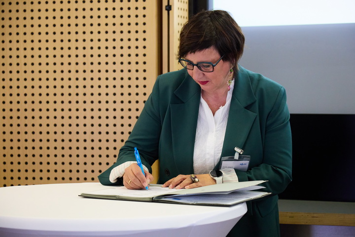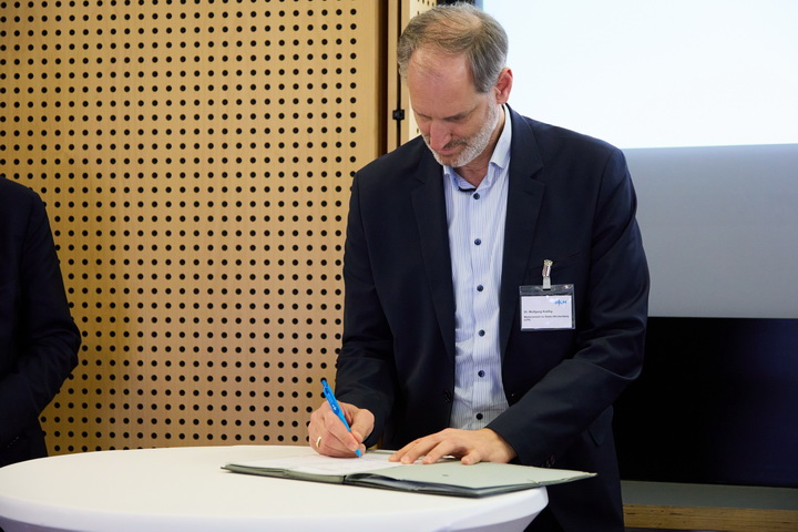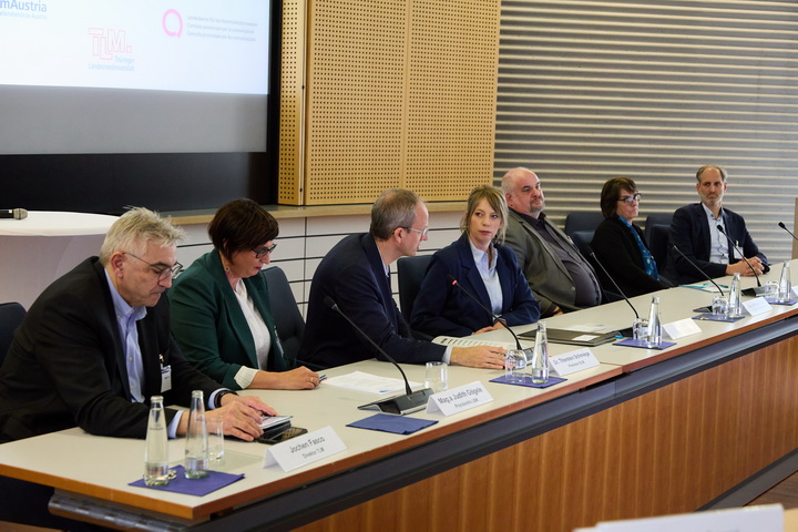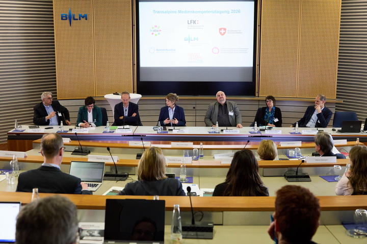 Gemeinsame Erklärung zur Kooperation in Sachen Medienkompetenz (v.l.n.r.): Jochen Fasco (TLM), Mag.a Judith Gögele (LBK Südtirol), Dr. Thorsten Schmiege (BLM), Dr. Wolfgang Kreißig (LFk), Dr. Susanne Marxer (BAKOM Schweiz), Mag. Michael Ogris (KommAustria)